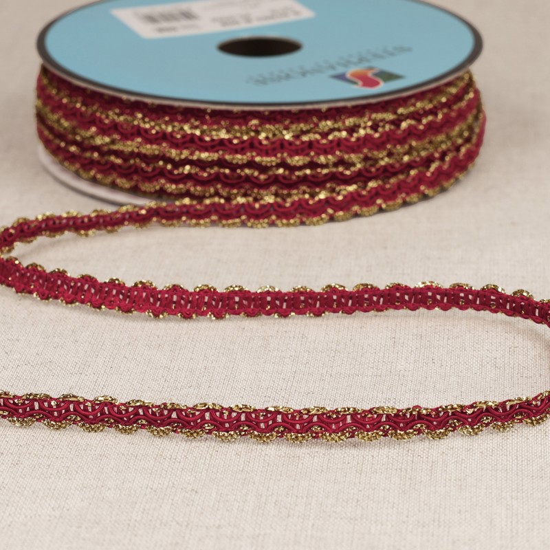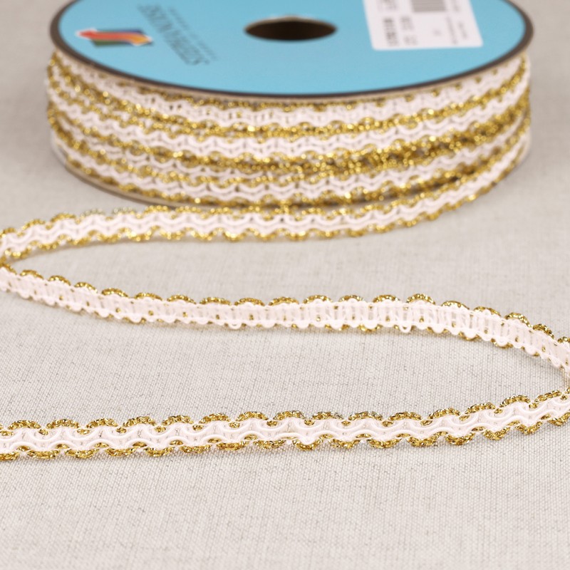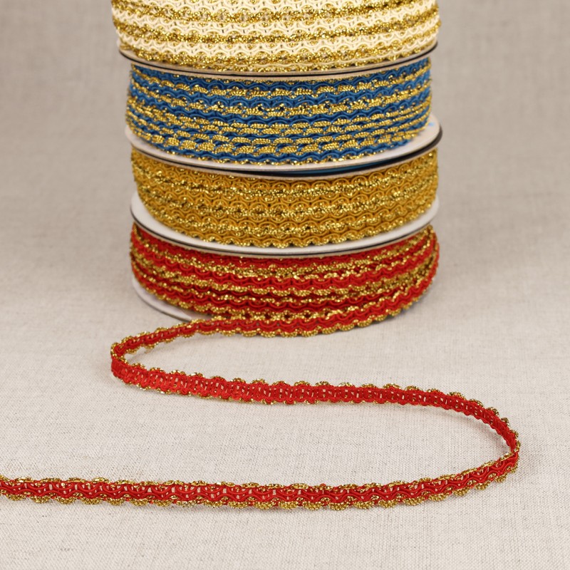 Le galon croquet est reconnaissable à sa forme ondulée caractéristique, en zigzag régulier. Dans sa version métallique, il est tissé avec un fil brillant qui capte la lumière et apporte une dimension décorative supplémentaire.