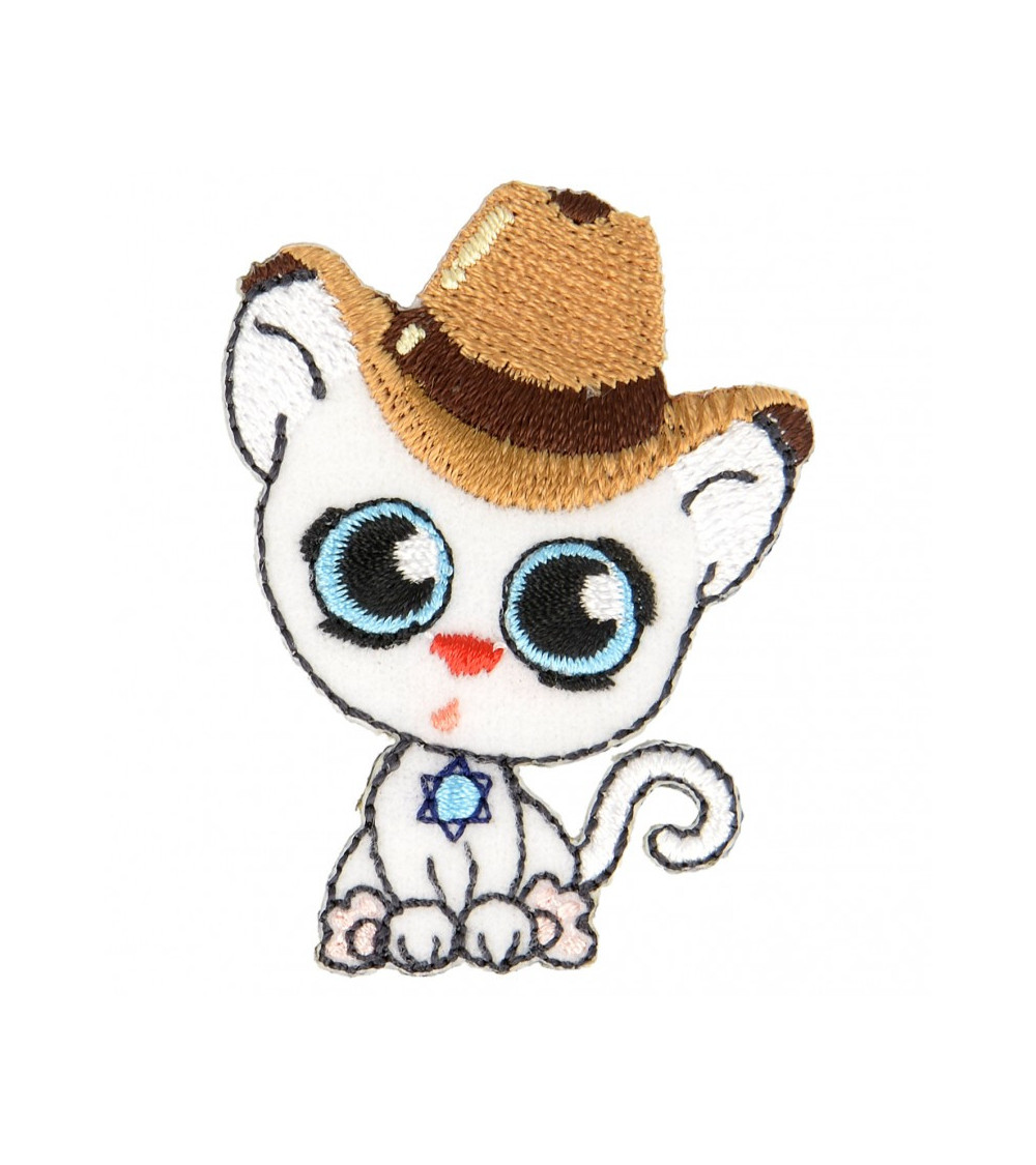 Iron-on patch cat with big eyes beige hat 5 cm x 3.5 cm