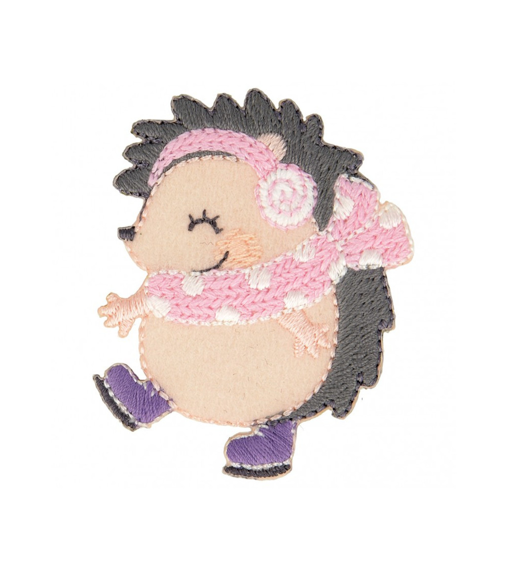 Hedgehog iron-on patch with pink scarf and ice skates 5.5 cm x 4 cm