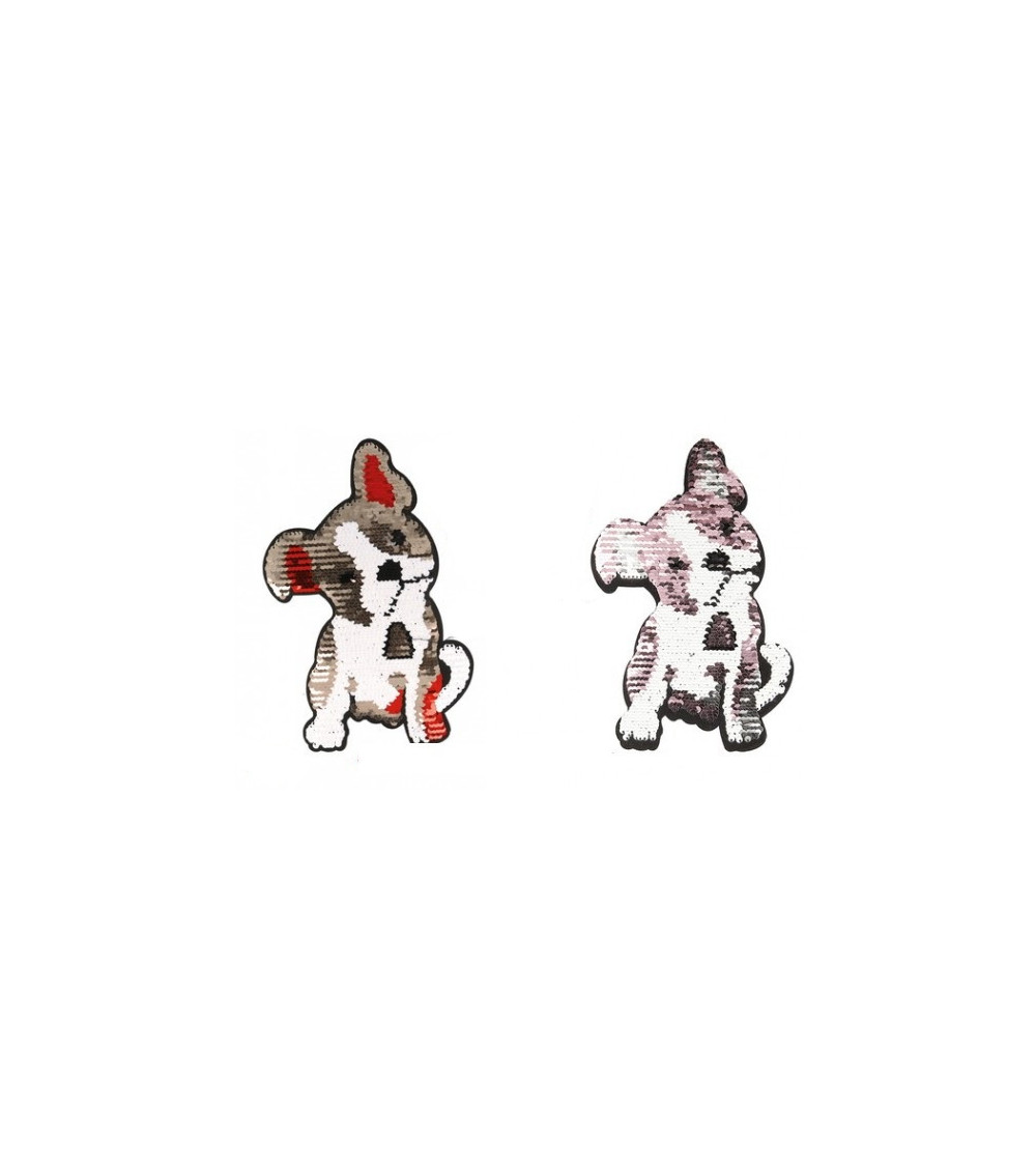XL reversible iron-on patch bulldog dog with gold/red sequins, reversible silver/pink 22cm x 13cm