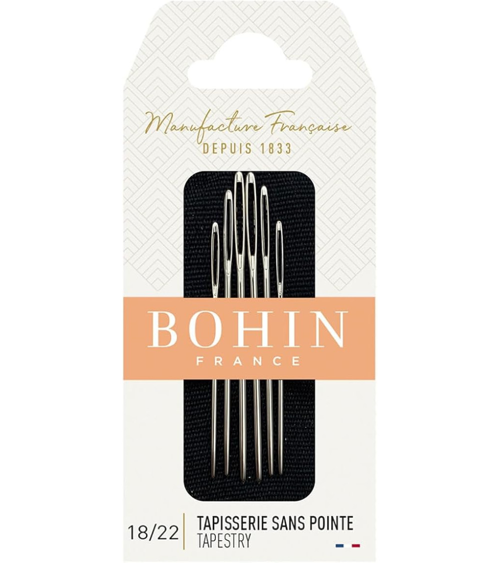 Las agujas sin punta para tapiz Bohin n°18 y 22 han sido especialmente diseñadas para satisfacer las necesidades de los trabajos de bordado y lienzo realizados sobre soportes regulares. Su punta redondeada les permite deslizarse de forma natural entre los hilos del lienzo sin perforarlos ni debilitarlos, preservando así la estructura del tejido y la calidad del resultado final.